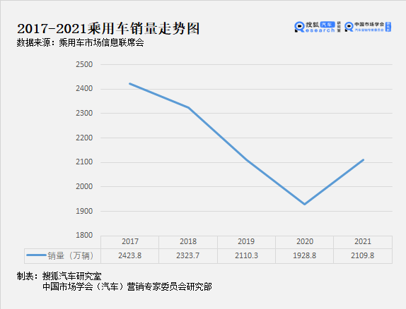 2021年疫情形式好转,但芯片短缺贯穿全年,多数车企遭遇“芯片危机”,产能得不到完全释放。这一问题对车市造成的影响在第三季度达到了顶峰,在第四季度趋于平缓。2021年,中国乘用车市场累计销量为2014.6万辆,同比增长4.4%,这是中国汽车销量自2017年开始下降后的首次上涨。2021年销量水平与疫情前的2019年的2110.3万辆相当,但与2017年顶峰的2423.8万辆仍有较大差距。